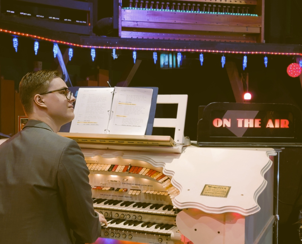 Organist and historian Sawyer Best at the seat of the Mighty Wurlitzer organ at Kenyon Hall during REPS Spooktacular 2023.